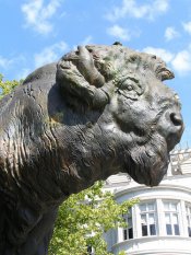 First, city planners and architects determined that the proximity and location of Dumbarton House posed a traffic congestion problem. Their solution, move the entire house 100ft, no small endeavor, to its current resting spot. And so, the Dumbarton Bridge got its name. The location of Dumbarton House was not the only construction problem facing the bridge. The proposed sections of Q Street, on either side of the bridge, were misaligned. The solution, much simpler than the previous, was to give the bridge one of its most interesting features, a curved roadway. The most striking features of the Dumbarton bridge are its four bullish bison sentries; poised and ready to charge bridge traffic and buck them over the railings. Designed by American sculptor Alexander Phimister Proctor, whose other Washington, DC mammalian works include the Buffalo Heads on Arlington Memorial Bridge and the Panthers on the Piney Branch/16th Street Bridge, these bison are the neighborhood gate watchmen, so watch out cause they don’t take sh#t. Pretty much, they’re the bridge’s secret service, minus the sun glasses. About three years ago, the bison were green, totally patinized and gorgeous. Then one day workmen restored the statues to their metallic, bronze coloring via some form of either protective coating or, gasp!, paint. Why it was suddenly decided to give these statues a new/old “look” is a mystery. Was there some neighborhood debate over restoring the bisons? Did those for and against restoration battled it out, while the bison grew more and more green? Or did the bison’s restoration ticket come up in the backlog of DC’s to do items? For me, the color restoration hasn’t dimished or increased the charisma and physical prescence of these omnispecent creatures. But perhaps the alterations, on some unconscious level, signify society’s collective attempts to remember and glorify the history, animals and people of the American frontier? To enstill them as symbols of our nation’s vitality, strength and integrity, and to not let them corrode and decay in the the annals of U.S. history and, more importantly, the hearts of the American people. |