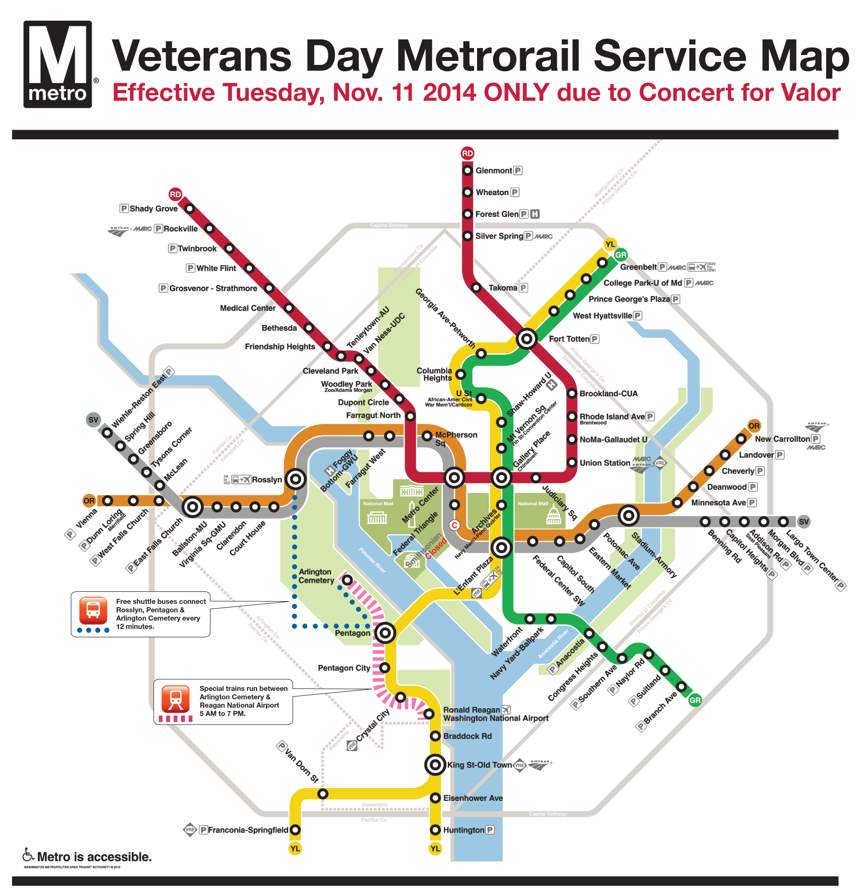1. All stations will be open except Smithsonian. Metrorail will open at 5 a.m. and close at midnight. Nine stations near the National Mall will remain open past midnight if necessary to accommodate concertgoers after the event (you must be in line by midnight). Arlington Cemetery will be served by rail shuttle trains from the south, as well as free buses from Rosslyn and Pentagon stations. 2. Additional Yellow Line trains will replace Blue Line service between Franconia-Springfield and Greenbelt. Because Yellow Line trains get Virginia riders to the concert 12 minutes faster than Blue Line trains, this service change will allow Metro to run trains more frequently and maximize space for other riders. Trains will run as frequently as every three minutes before and after the event. Riders who normally use Blue Line trains can use Yellow and Silver/Orange trains instead (transfer at L'Enfant Plaza), or take advantage of free shuttle bus service between Pentagon and Rosslyn from 5 a.m. until closing. 3. Know what not to bring. Bicycles and large coolers will be prohibited on Metrorail all day to maximize space for all riders. Prohibited items at the concert include alcohol, bicycles, explosives/fireworks, glass containers, coolers, animals (except service animals), weapons, and more. Be sure to check the event website for a complete list. If in doubt about whether an item will be permitted, it is best to leave it home. In addition, for security reasons, all Metrorail restrooms will be closed on Veterans Day. 4. Travel without transferring. Metro recommends planning your trip so that you do not have to transfer between rail lines. Choose a station near the National Mall on the same line as where you begin your trip, and then return to the same station after the concert. 5. Pre-load your SmarTrip card. To avoid long lines after the concert, load enough value on your farecard or SmarTrip in advance for your entire roundtrip. If using a paper farecard, add $2 per roundtrip. (To avoid this surcharge, use SmarTrip.) Due to the holiday, off-peak fares will be in effect all day. Parking at all Metro-owned facilities will be free. For complete details, visit wmata.com/valor and download the Official Rider Guide here. |